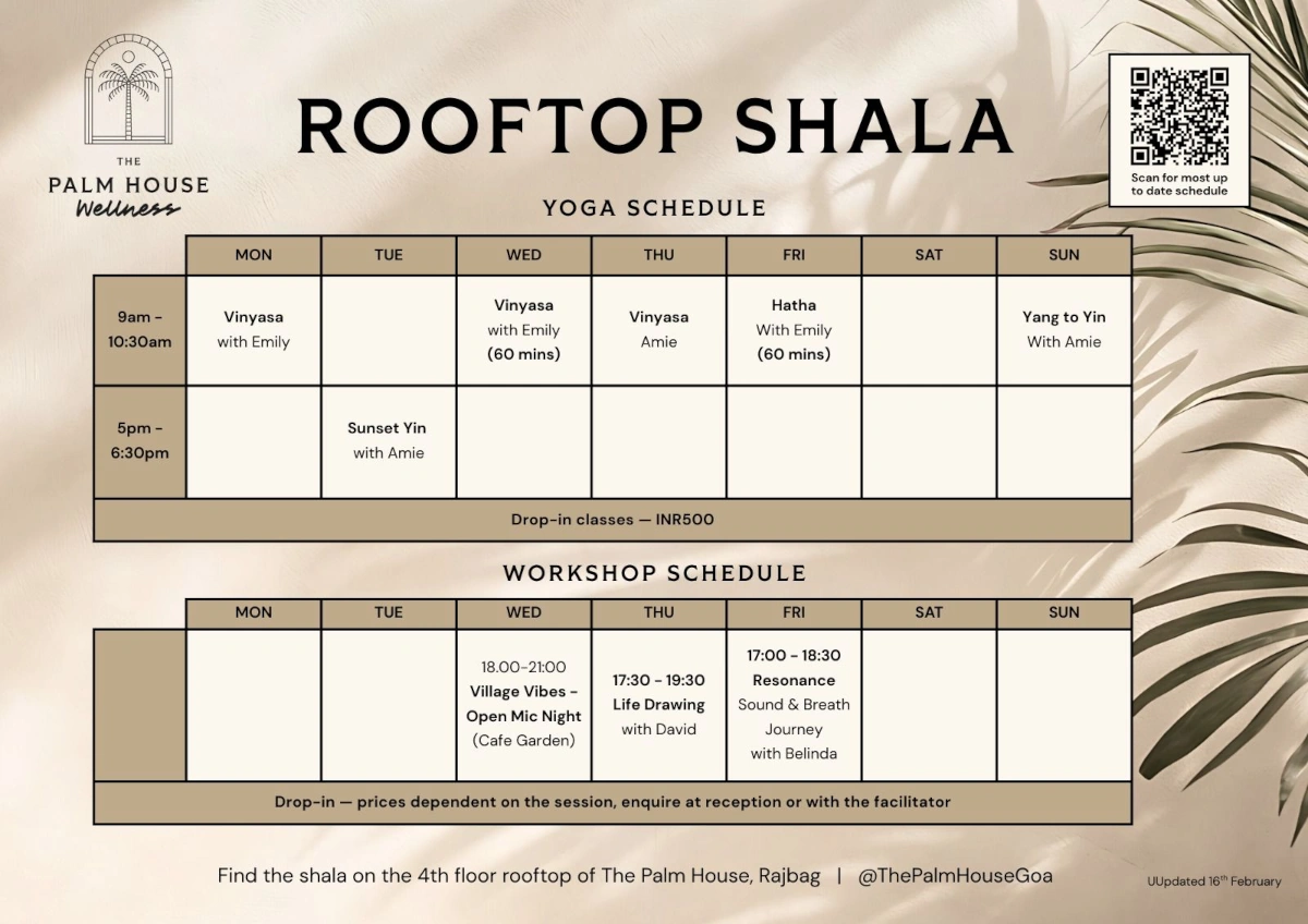 Please arrive a few minutes early to the Shala on the 4th Floor of The Palm House. When you arrive you can pay for your class, set up your mat and settle in.